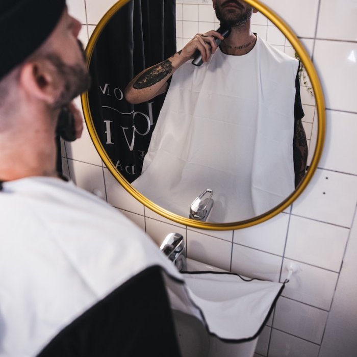 Trött på skäggstrån från dig eller din partner efter en rakning? Hårstrån som lägger sig i badrumsmattan, längst handfatskanterna eller över golvet. Nu är det ett minne blott med detta smarta rakförkläde! Fungerar lika bra i badrummet som i båten, sommarstugan eller var du nu vill utföra rakningen!
