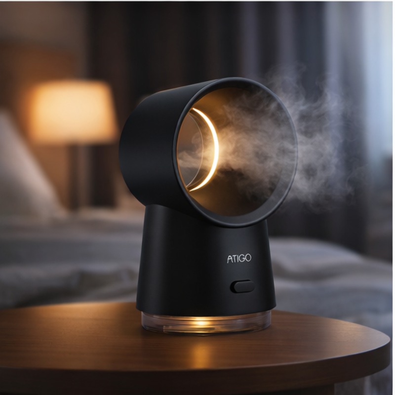 Upptäck ATIGO CoolMist – en kompakt bladlös bordsfläkt som sprider en uppfriskande bris tillsammans med en fin vattendimma. Kombinationen av luftflöde och dimma ger en sval och behaglig känsla i rummet, särskilt under varma sommardagar.